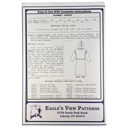 This Blanket Capote Pattern is for adults (men's sizes 30 through 50 and women's sizes 8 through 20). The fur traders made extensive use of the Blanket Capote and this apparel, with bright color and contrasting stripes, was quickly adopted by the Indians of North America. These coats were popular along the western moving frontier and were later used by soldiers and frontiersmen. They have become both popular and fashionable for todays men, women and children. This pattern is for the traditional mid-calf length and has variations in hood tassels and fringe.
