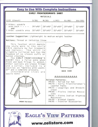 This Early Frontiersman Leather Shirt Pattern features easy-to-follow instructions to make a leather shirt style worn in the early 19th century by fur trappers and Indians alike. The shirt is slightly tailored but has the freedom of no sleeve cuffs or button closings. The Early Frontiersman's Shirt has a false yoke when front and back fringe is added. Other options are sleeve fringe and a collar. Included is a section on "Working with Leather" and a complete glossary of terms used. May be made in sizes Small (36) through XX-Large (50).