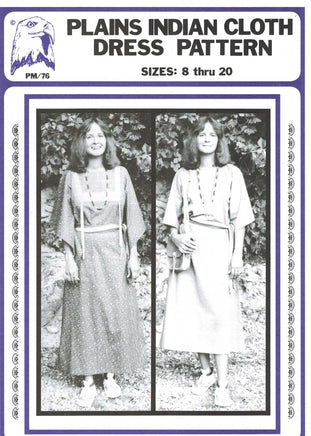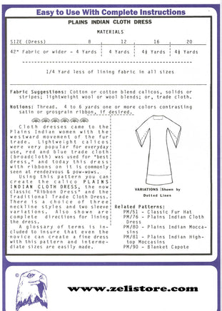 Included in the Plains Indian Cloth Dress Pattern (Sizes 8 thru 20) are options for three different neckline styles and two distinct sleeve variations. Cloth dresses came to the Plains Indian women with the westward movement of the fur trade. Light calicos were very popular for everyday use, red and blue trade cloth (broadcloth) was used for "best dress," and today this dress with ribbons on it is commonly seen at rendezvous and powwows. Using this pattern, you can create the calico Plains Indian Cloth Dress, the now classic "Ribbon Dress" and the Traditional Trade Cloth Dress. Also shown are complete directions for lining the dress. Instructions are enclosed for making the ribbon dress and the trade cloth dress is also easily made from this fine pattern.