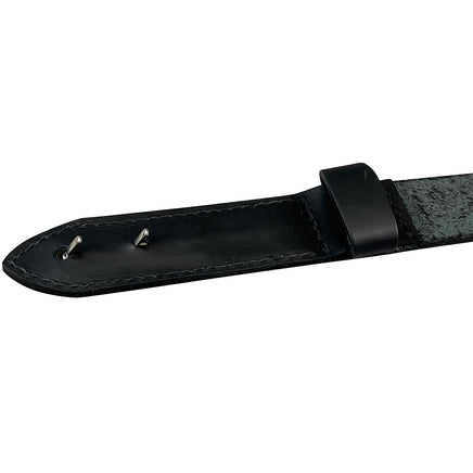 Each belt is handmade in Canada in our own shop with a finished edge. We sew a double metal prong between two layers of leather for added security. Belt tip is embossed.