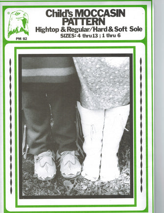 One Child's Moccasin Pattern with instructions for making both regular and hightop moccasins with either hard or soft soles. The sizes are child's 4 through 13 and teen's 1 through 6. Patterns are given for full sizes and if the child wears a size 2 1/2 (for example), you simply use the next smallest full size (size 2, in this example) as the leather will stretch and that will fit best.