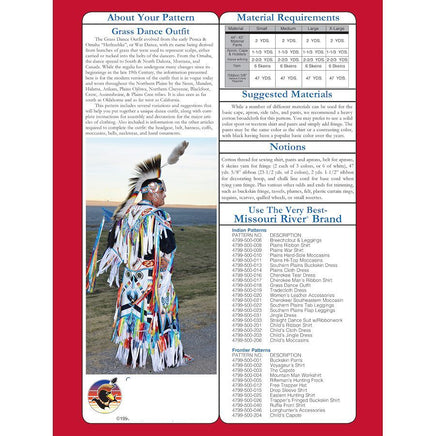 Grass Dance Outfit Pattern includes instructions for assembly and decoration of a cape or shirt, apron, side tabs and pants. Our Grass Dance Outfit Pattern produces a correctly styled modern Grass Dance outfit. Includes information on other components, accessories and variations of the outfit.