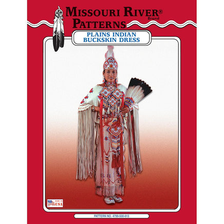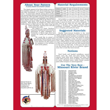 Plains Indian Buckskin Dress Pattern consists of information on several tribal styles such as Comanche, Kiowa, and Cheyenne. Beadwork placement, decorative cuts & accessories, fringe treatment, etc. are discussed so you can produce a correct hide dress with the appropriate detailing. Sizes 6-20.