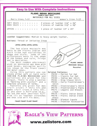 This great Plains Indian Moccasin Pattern includes instructions for men's sizes 7 through 12 and women's sizes 5 through 10. The Two Piece Moccasin was basic to the Indians of the Plains as well as to many other areas of North America and each Tribe had variations in shape and style.
