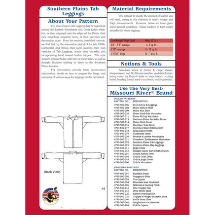 Southern Plains Flap Leggings Pattern provides options for three of the most common Southern Plains Flap Leggings design variations. Men's flap-style buckskin leggings were worn throughout the Plains in historic times, but in the 1800s, the Southern Cheyenne, Arapaho, Comanche, Kiowa and others added some distinctive Southern features. The pattern includes highly illustrated and detailed instructions on how to make the leggings, along with photos and descriptions of decorative options.