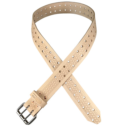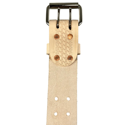 This is a solid leather belt with reinforced copper rivets and a steel 2-prong roller buckle.