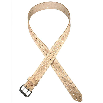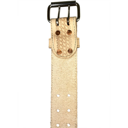 This is a solid leather belt with reinforced copper rivets and a steel 2-prong roller buckle.