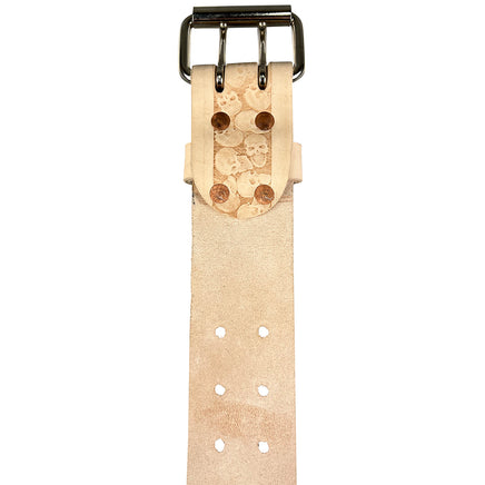 This is a solid leather belt with reinforced copper rivets and a steel 2-prong roller buckle.