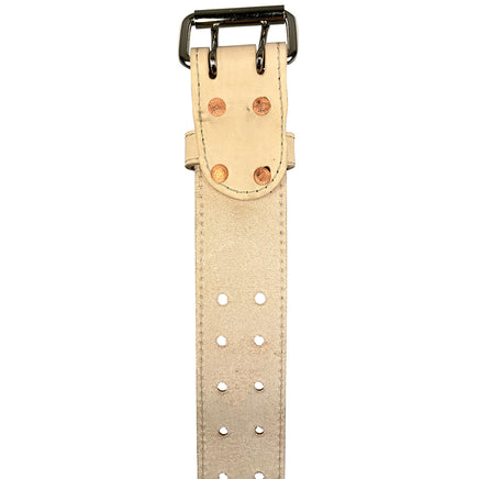 This is a solid leather belt with reinforced copper rivets and a steel 2-prong roller buckle.