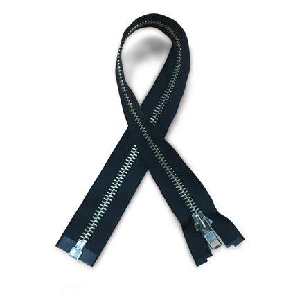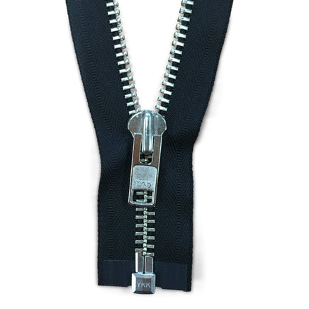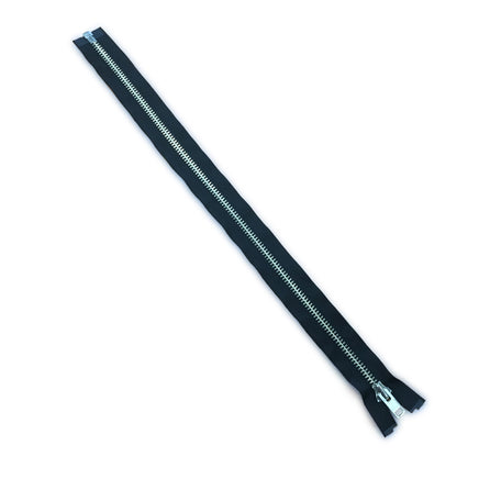 22" - Black with silver teeth, one way zipper, open