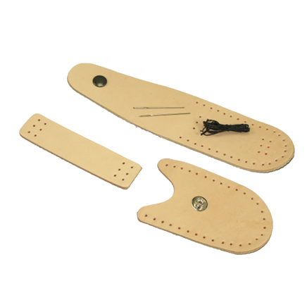 With pre-punched tooling leather, snap (attached), thread, needles and instructions.