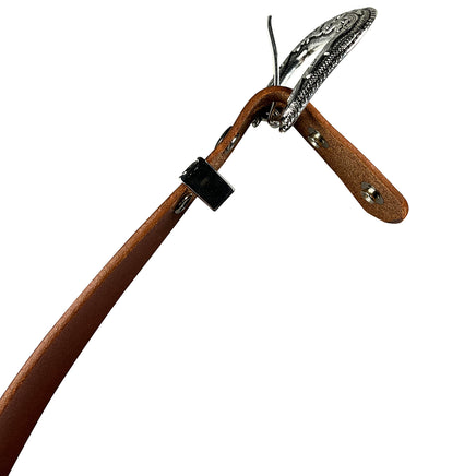 We attach a 3 piece buckle set which includes buckle, metal keeper and tip.