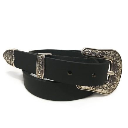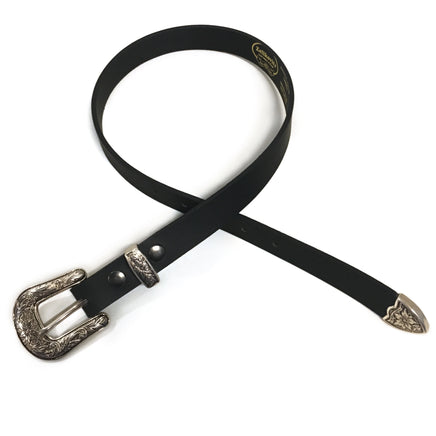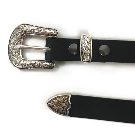 We attach a 3 piece buckle set which includes buckle, metal keeper and tip.