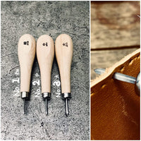 On conventional tools, the blade shape is tapered so the hole size can change depending on how deep you stick it through the leather sheet. We've developed our tool so as to make same hole size and can stitch uniform.
